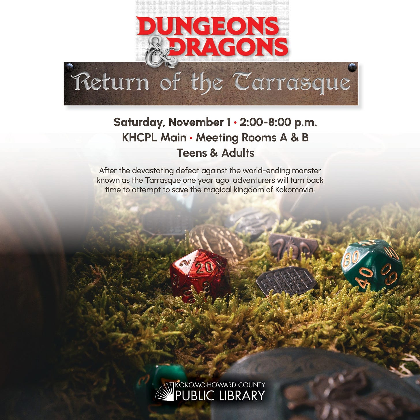 After the devastating defeat against the world-ending monster known as the Tarrasque one year ago, adventurers will turn back time to attempt to save the magical kingdom of Kokomovia! Enjoy an evening of Dungeons and Dragons on Sat., Nov. 1, from 2-8 p.m. Register for this event by visiting www.khcpl.org and clicking on Events.