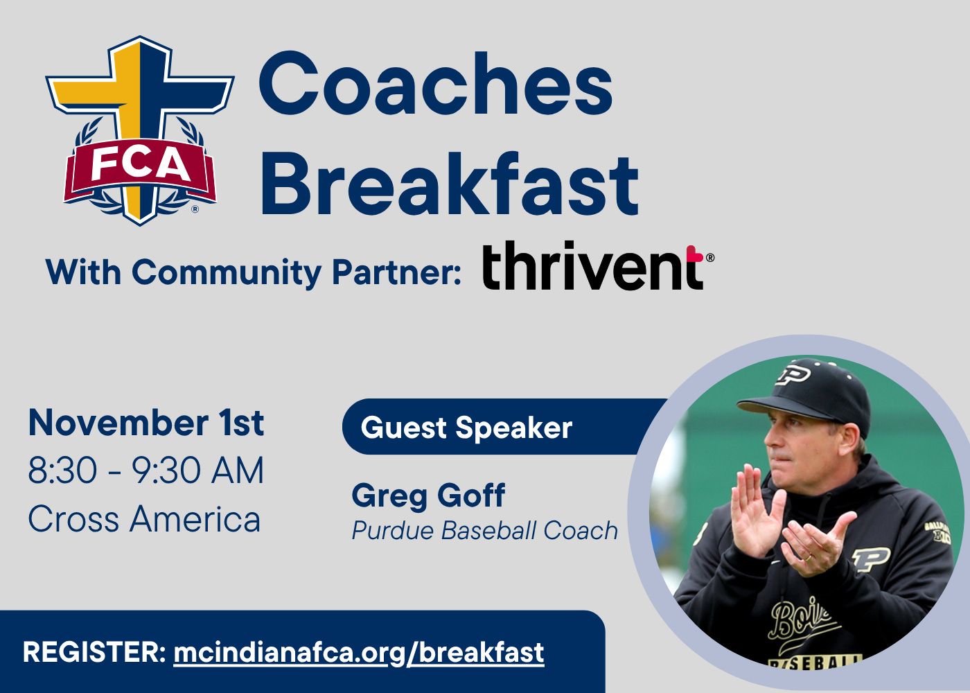 The Fellowship of Christian Athletes will hold a Coaches Breakfast on Sat., Nov. 1, from 8:30-9:30 a.m. at the Cross America Community Center, 840 Daniel Dr. The morning will feature a special message from Purdue University baseball coach Greg Goff. Register for this free event by Oct. 28 at www.mcindianafca.org/breakfast
