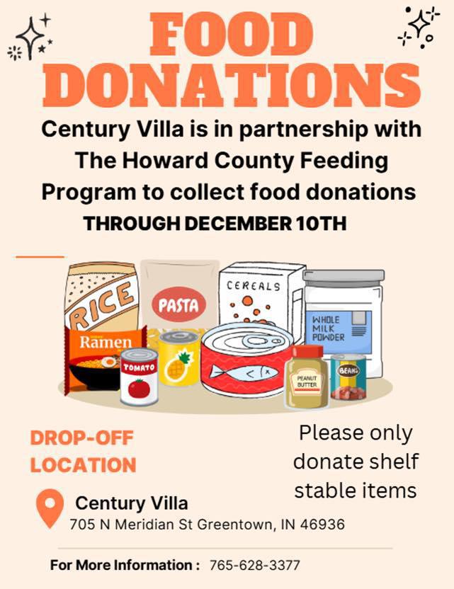 Century Villa, located at 705 N. Meridian St., will accept store-bought canned goods and shelf-stable food items from now through Dec. 10. Donors are asked to deliver their items to the donation table located at the nurse’s station within the facility.