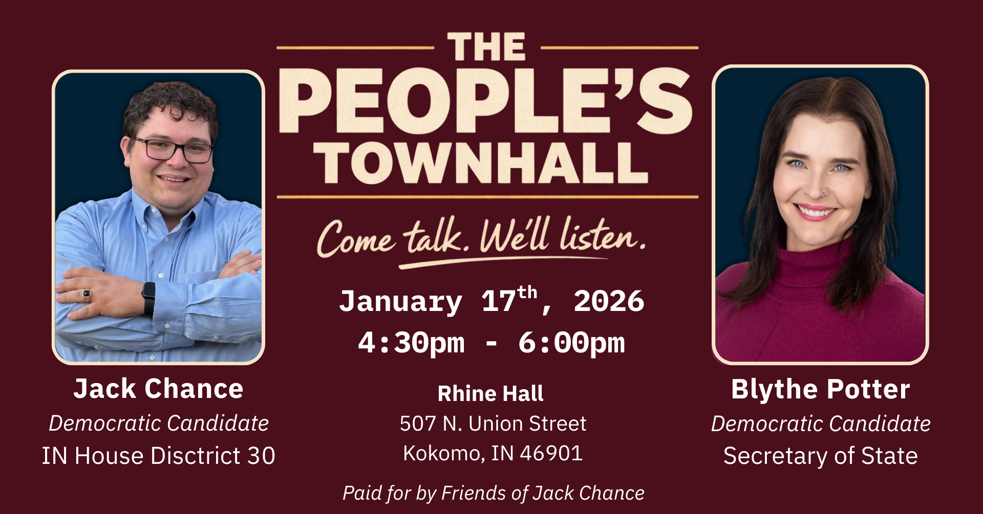 The People’s Townhall is designed as a community-first conversation, centered on listening to working Hoosiers. The event’s hosts are Indiana House District 30 candidate Jack Chance and Indiana Secretary of State candidate Blythe Potter. The two Democratic candidates will each offer brief opening remarks, followed by moderated questions led by former Kokomo Mayor Steve Daily, and an open floor for public questions and discussion, centered on ensuring everyday voices are heard.