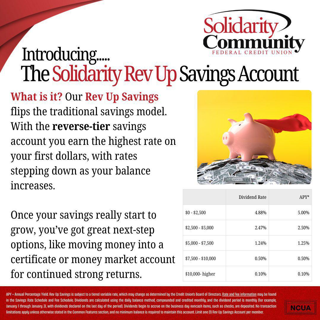 Solidarity Community Federal Credit Union is excited to announce the launch of its new Rev Up Savings Account, a member-focused savings product designed to help more people build financial momentum early in their savings journey.