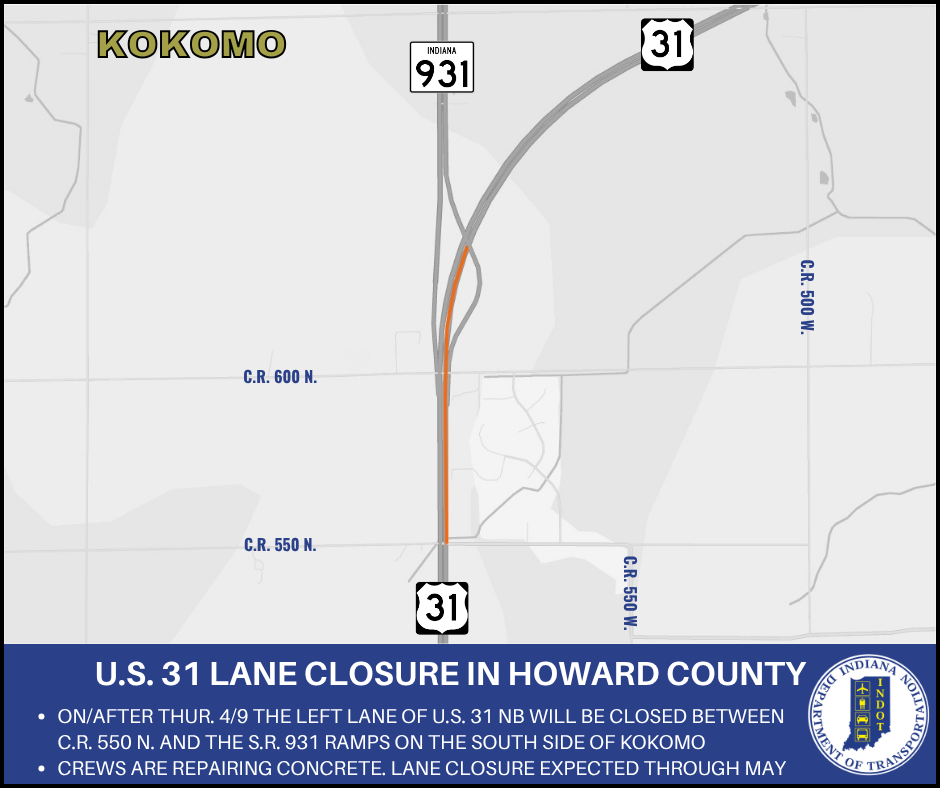 Beginning on or after Thursday, April 9, the left lane of U.S. 31 northbound will be closed between County Road 550 N. and the State Road 931 ramp on the south side of Kokomo. The lane is expected to be closed through the end of May, weather permitting.