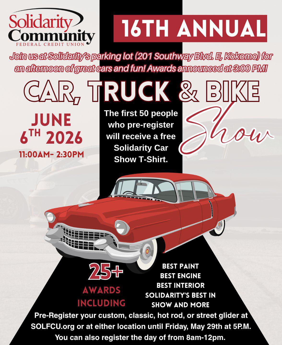 This article is brought to you by Solidarity Community Federal Credit Union. Rev those engines, Kokomo! Join us for the 16th Annual Solidarity Car, Truck & Bike Show, a FREE, family-friendly event you won’t want to miss! It all takes place Saturday, June 6, from 11:00 AM – 2:30 PM at the Solidarity Main Office, 201 E. Southway Blvd.