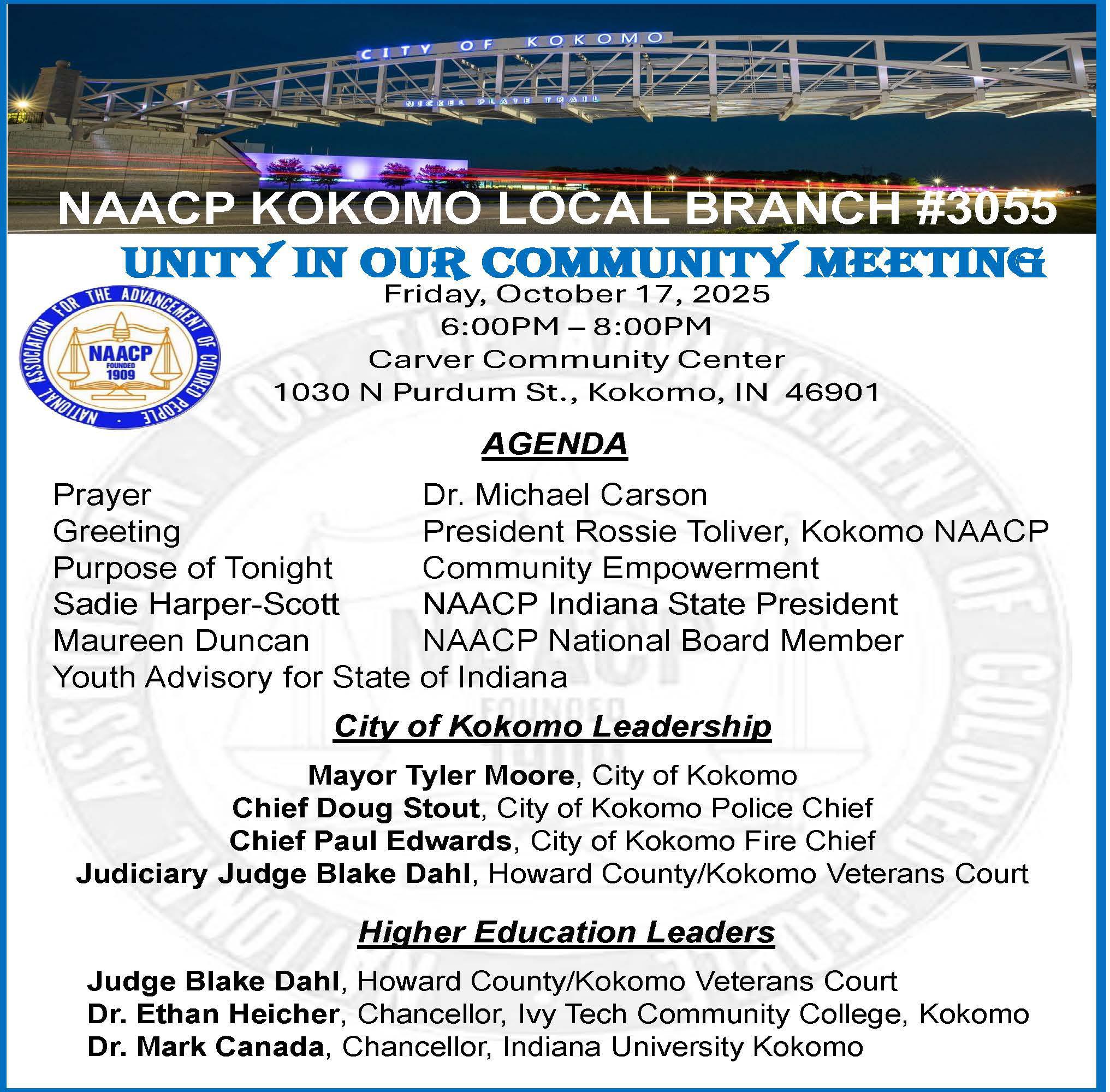 The NAACP Kokomo Local Branch 3055 will hold a Unity in Our Community meeting on Fri., Oct. 17, at the Carver Community Center, 1030 N. Purdum St., from 6-8 p.m. The event is designed to empower the local community to act for the benefit of all.