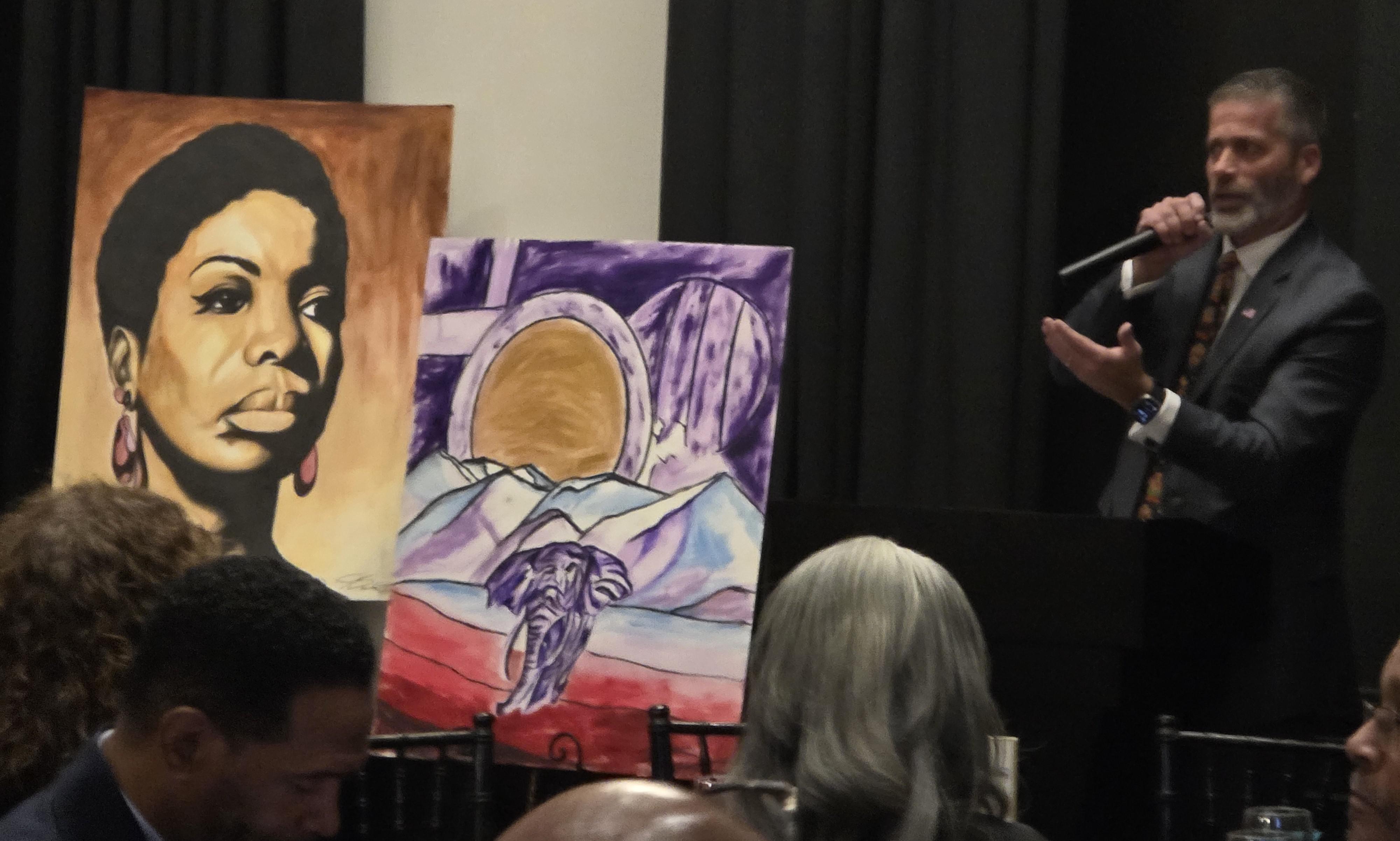 Their art not only decorated the tables as centerpieces but also became part of the live auction led by Paul Wyman. Among the auctioned items were two Carver Kids art pieces, paintings by Executive Director JC Barnett III, titled “Bold as the Blues” and “Majesty Rising,” a signed Kokomo Bobkats basketball, and exclusive spirits, including Steph Curry’s signature bourbon, Gentleman’s Cut. The bidding was lively and full of enthusiasm, with one guest remarking that it was “one of the most exciting auctions I’ve ever seen.”