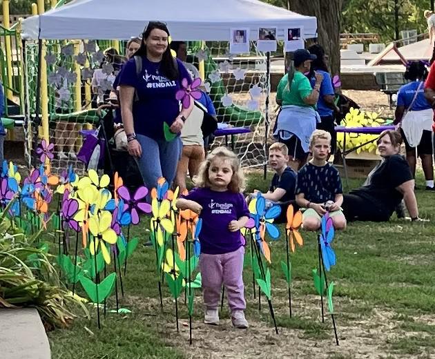 Along the base of the stage at the performing arts pavilion within the park, there was an array of pinwheel flowers in multiple colors. Gentry explained that each color meant as people in the crowd held their flowers aloft.
