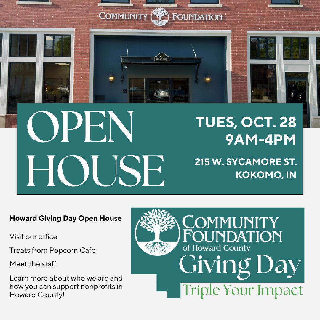 The Community Foundation of Howard County will recognize Giving Day on Tue., Oct. 28. The Foundation will hold an open house on that date, welcoming the public to visit its offices at 215 W. Sycamore St. for tasty treats, Giving Day swag, and information about donating to support nonprofit organizations in Howard County.