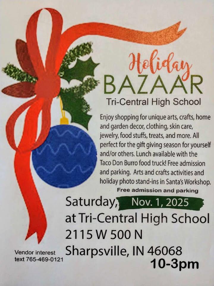 The Holiday Bazaar runs from 10 a.m. until 3 p.m. at Tri-Central High School, 2115 W, 500 N, Sharpsville. Admission and parking are free.