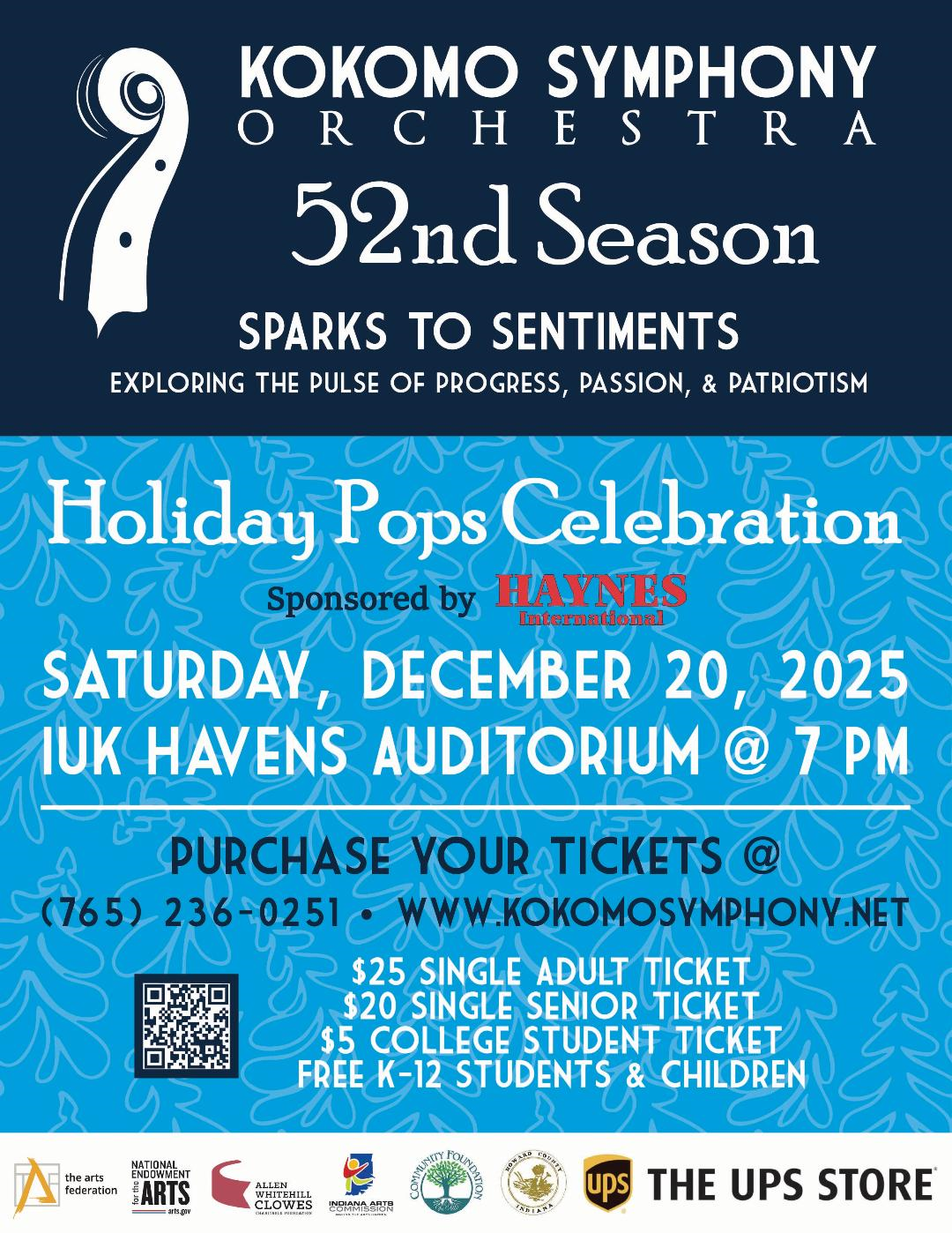 Please join the Kokomo Symphony Orchestra for their second season concert, the Holiday Pops Celebration, on December 20, 2025, at 7 p.m. at IUK’s Havens Auditorium. Get into the holiday spirit with a series of favorite music from the sacred to the secular and classical to popular!