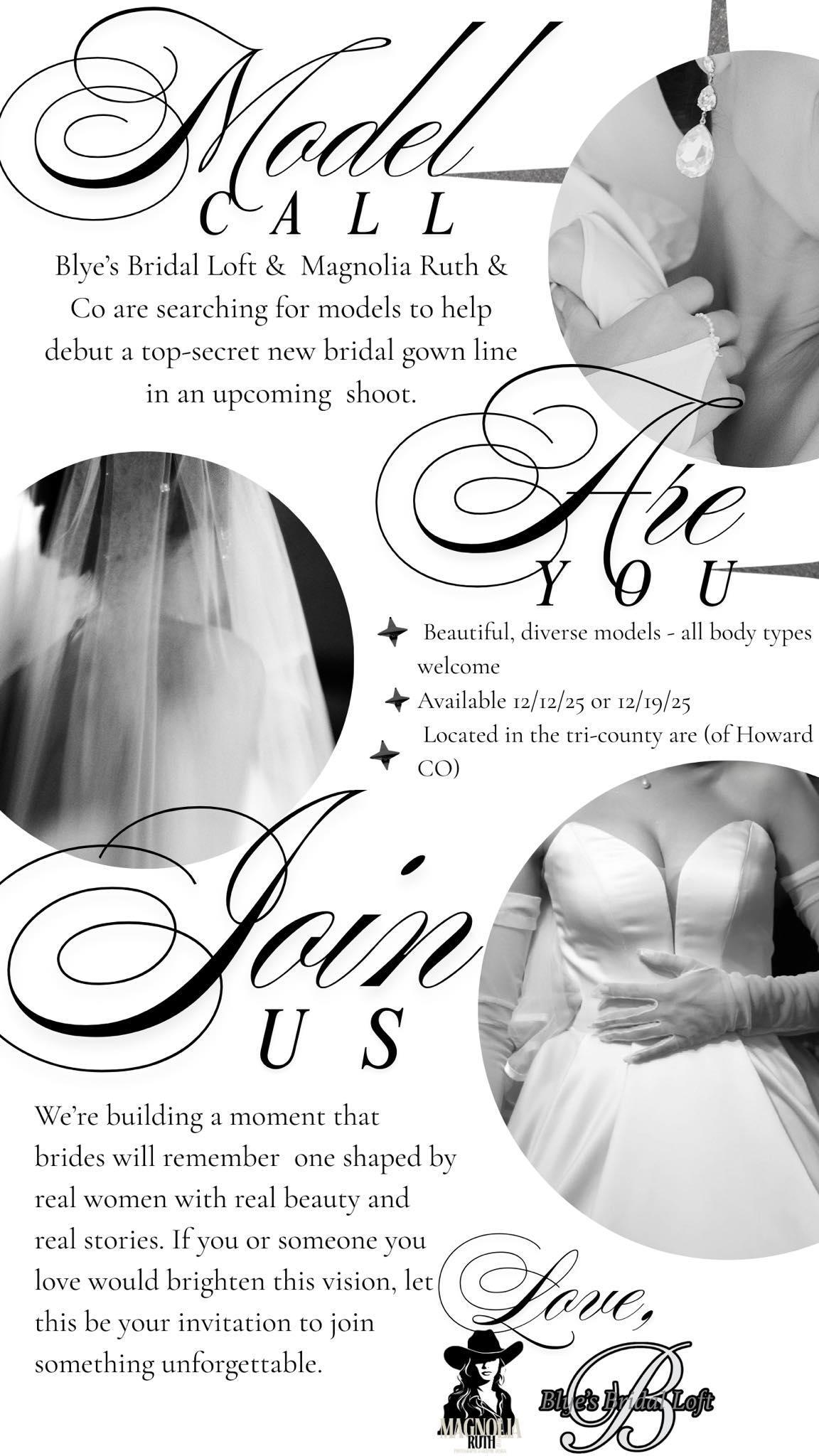 This article is brought to you by Blye’s Bridal Loft. Blye’s Bridal and Magnolia Ruth & Co are teaming up for something extraordinary. We are preparing to launch a top secret and spectacular new bridal gown line, and we are searching for models to help bring this vision to life in an upcoming editorial style bridal shoot.