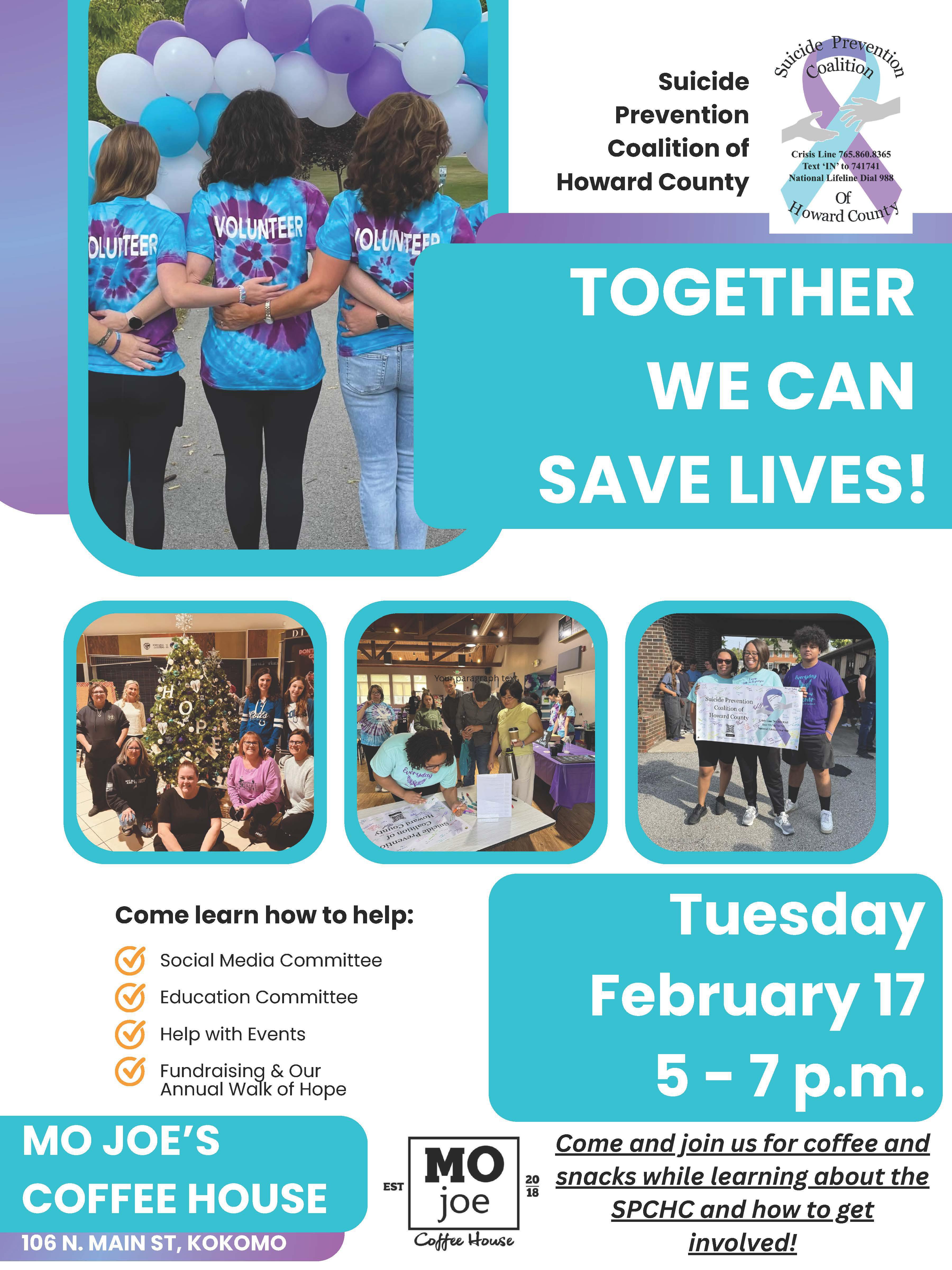 The Suicide Prevention Coalition of Howard County will hold an open house Tue., Feb. 17, from 5-7 p.m. at Mo Joe’s Coffee House, 106 N. Main St. The event will be an opportunity to learn about the coalition and how to get involved with its mission.