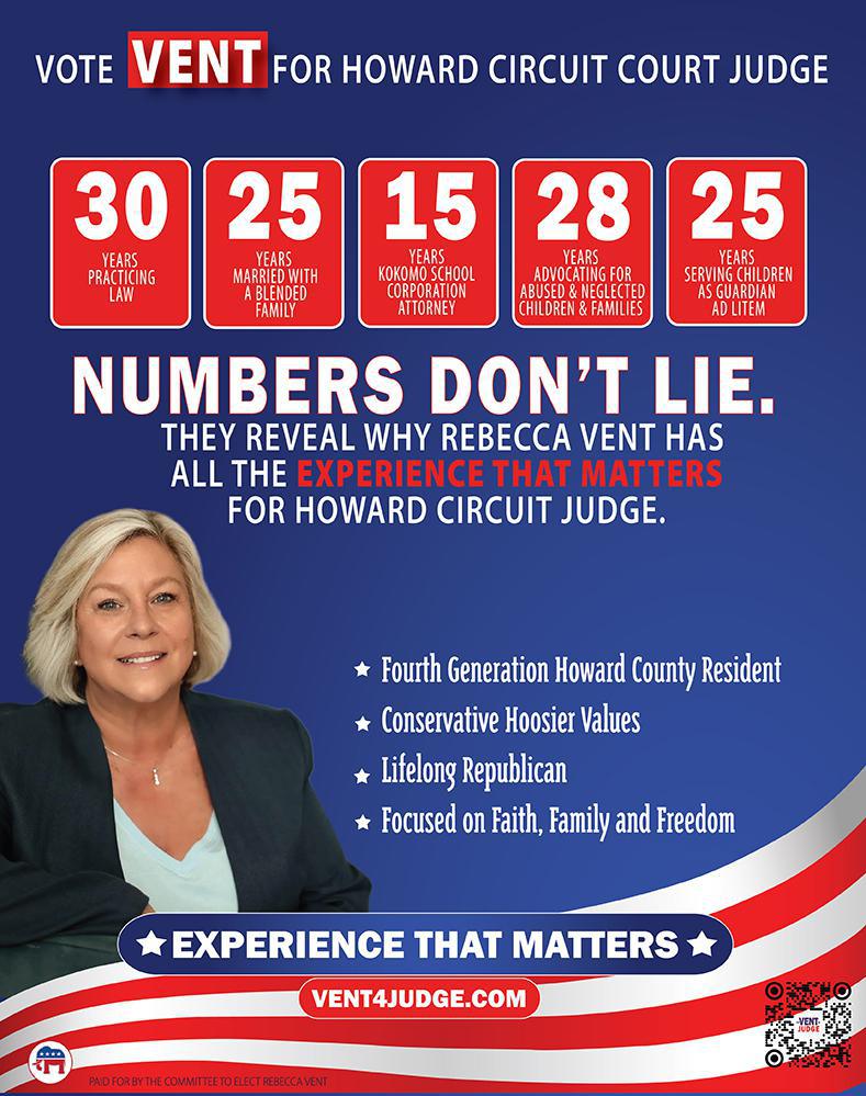 This article is brought to you by Rebecca Vent for Judge. Rebecca Vent is running for election as the next Judge of Howard Circuit Court. An attorney with 30 years of legal experience, Rebecca’s extensive background in family law, civil law, and criminal law sets her apart. Learn more by visiting www.vent4judge.com