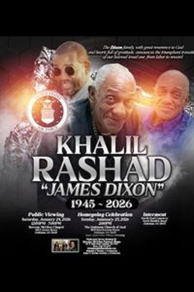 Khalil Rashad a.k.a. James Dixon was born March 8, 1945, to Clinton Dixon Sr. and Emma Lou Cason-Dixon in Pidcock, Brooks County, Georgia. He was raised from four years old by his stepdad James Calvin Williams Sr. and his mother Emma Lou Cason-Williams in Pidcock. They all preceded him in death. James was the second oldest of eight children.