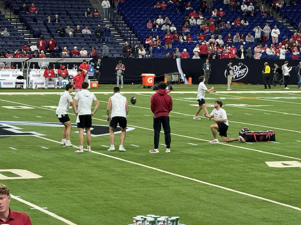 Mitch Knepley working with the IU quarterback staff at the Big Ten Championship at Lucas Oil Stadium. Photo courtesy of the Owens family.