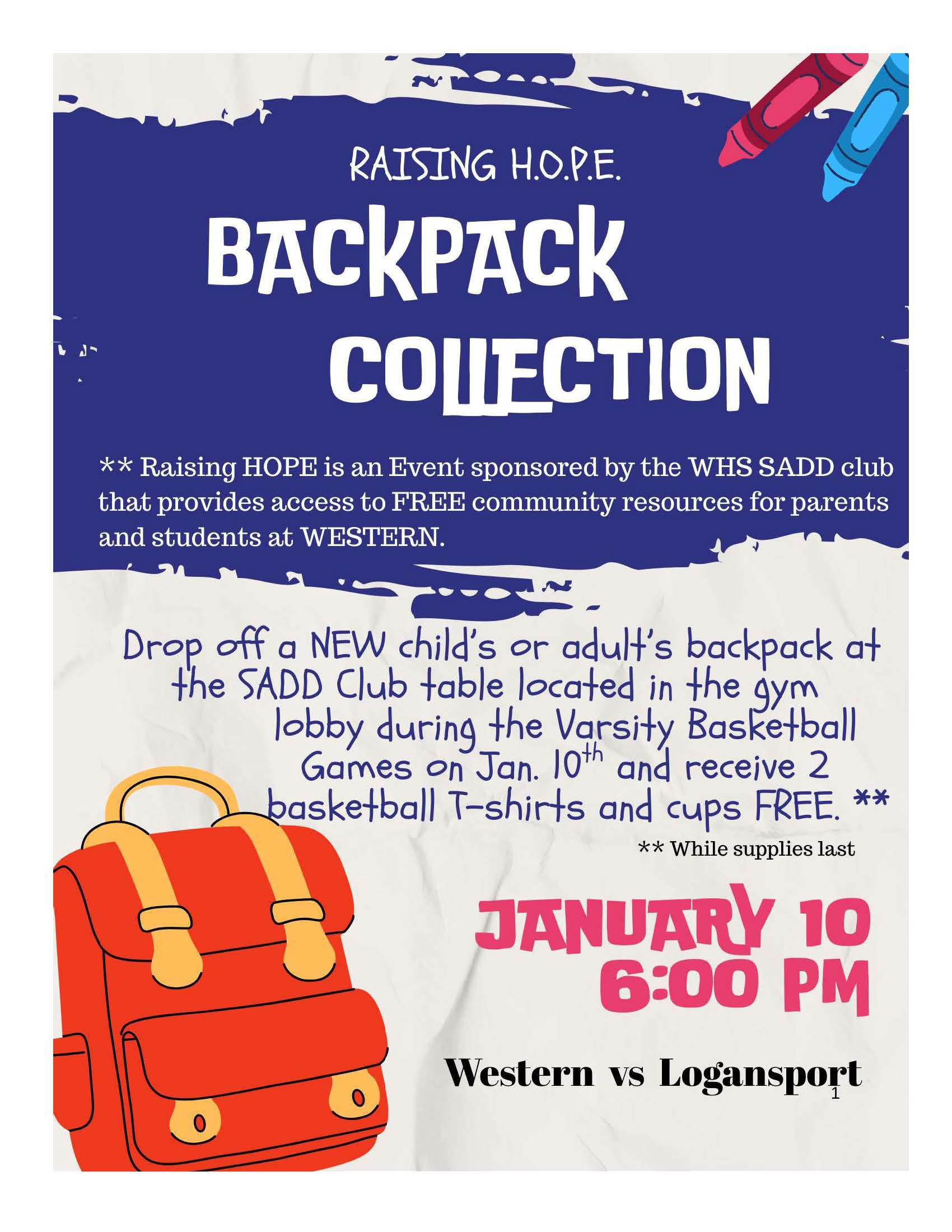 The SADD – Students Against Drunk Driving -- club at Western High School will host a Back-to-School night in August as a Raising HOPE Community Event. In preparation for that effort, the club will host a backpack collection at the Western boys’ and girls’ varsity basketball games taking place Sat., Jan. 10.