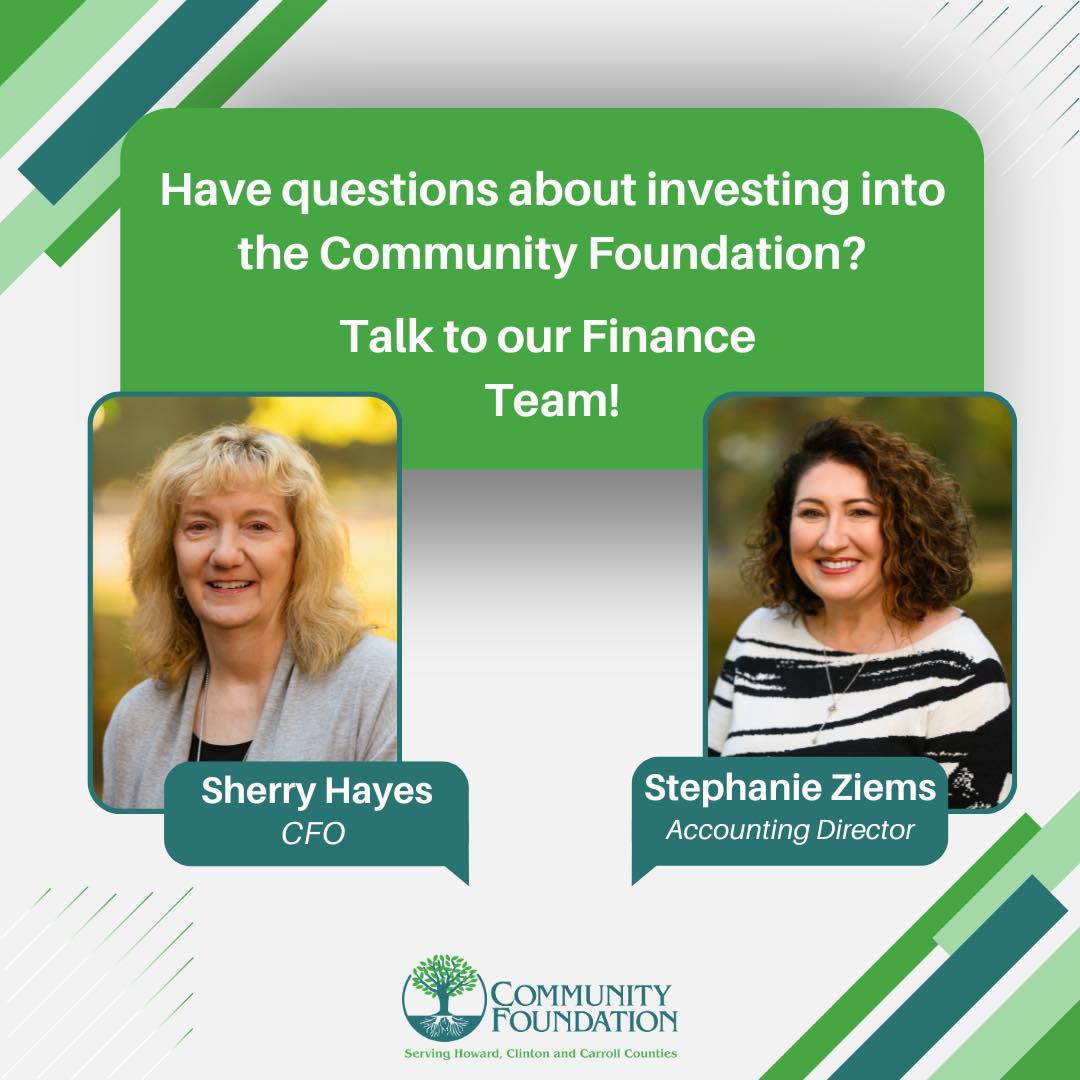 This article is brought to you by the Community Foundation Serving Howard, Clinton, and Carroll Counties. Wondering how exactly your generosity is invested into our community? Talk to our finance team! Our CFO, Sherry, and Accounting Director, Stephanie, oversee all our financial operations and ensure that we are being good stewards of every dollar gifted to our foundation. They are happy to assist with any questions about your funds or our investment processes.